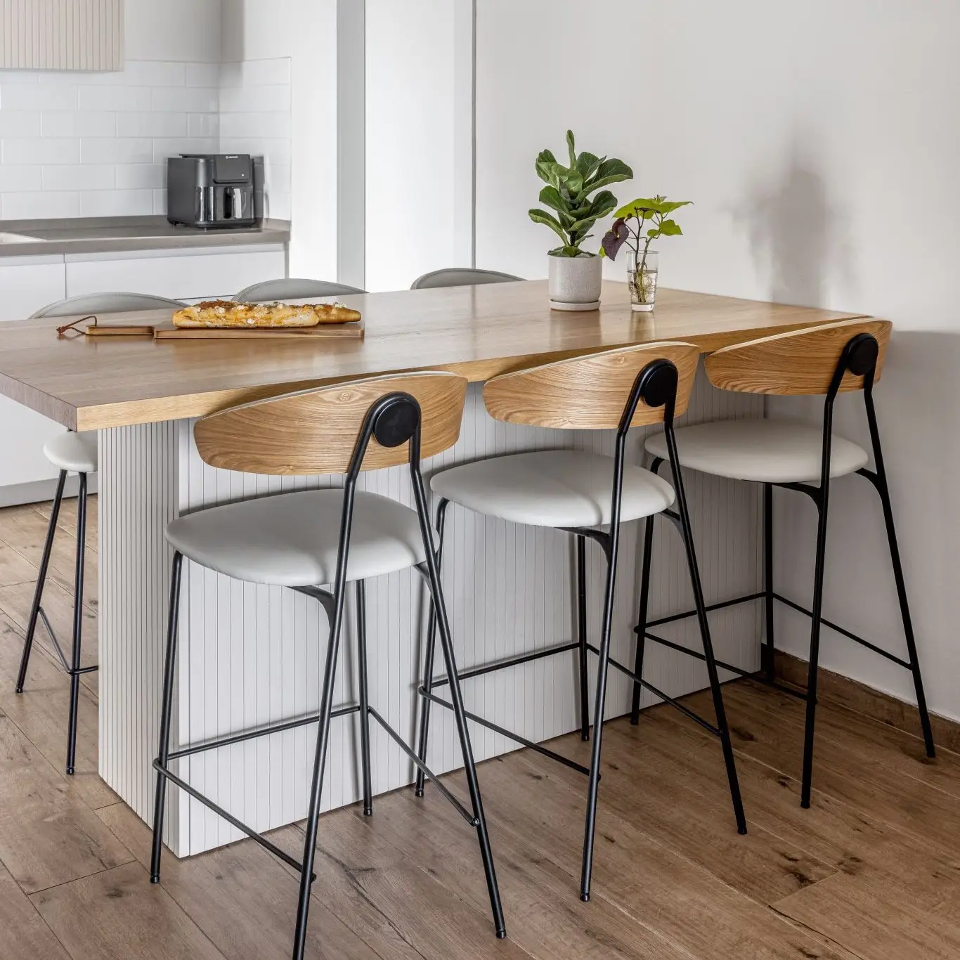 BAR NICOLA הוא שרפרף בר מודרני עם משענת גב מעוקלת מעץ, מושב מרופד לבן ורגליים ממתכת שחורה, המוצג מאחור על רקע לבן חלק.