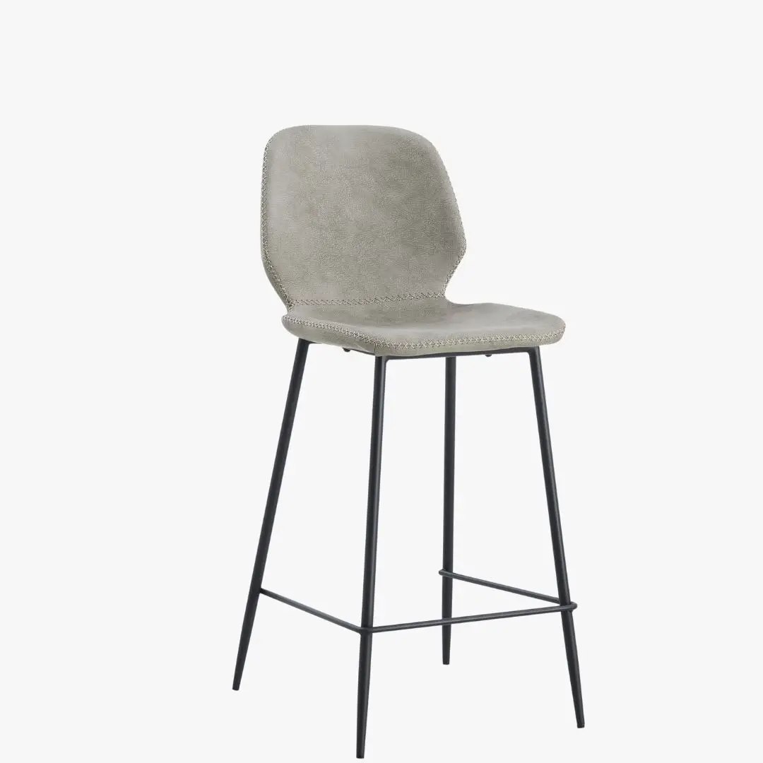 כיסא בר מעור חום עם עיצוב קצה תפור ומשענת גב מעוקלת, נתמך בארבע רגלי מתכת שחורות דקות.