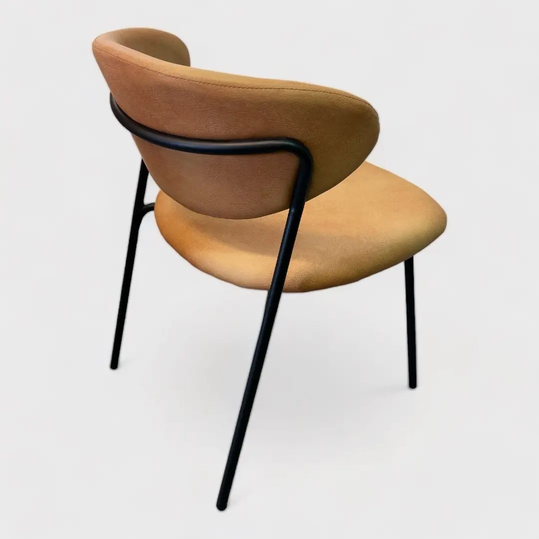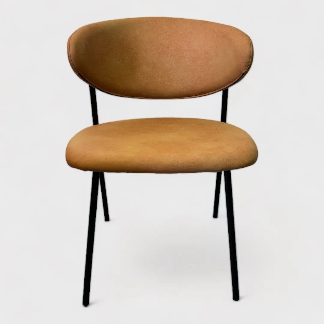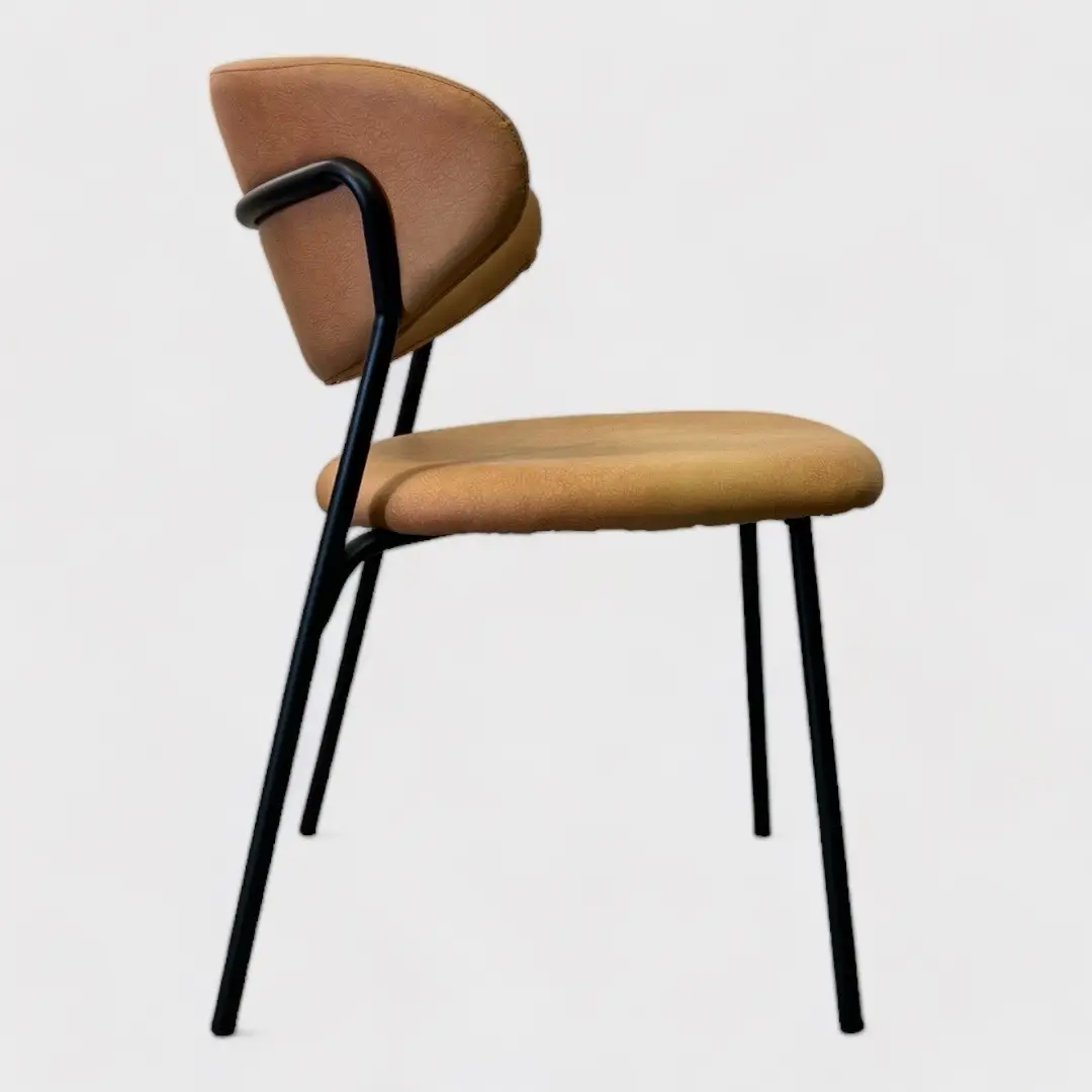 כיסא אלגנטי ומעוצב בגוון כאמל בהיר עם משענת שיכולה לשמש גם כידיות. רגלי הכיסא מברזל מגולוון בגוון שחור, וריפוד הכיסא מחומר חזק שניקרא PU, העמיד בשחיקה גבוהה.
