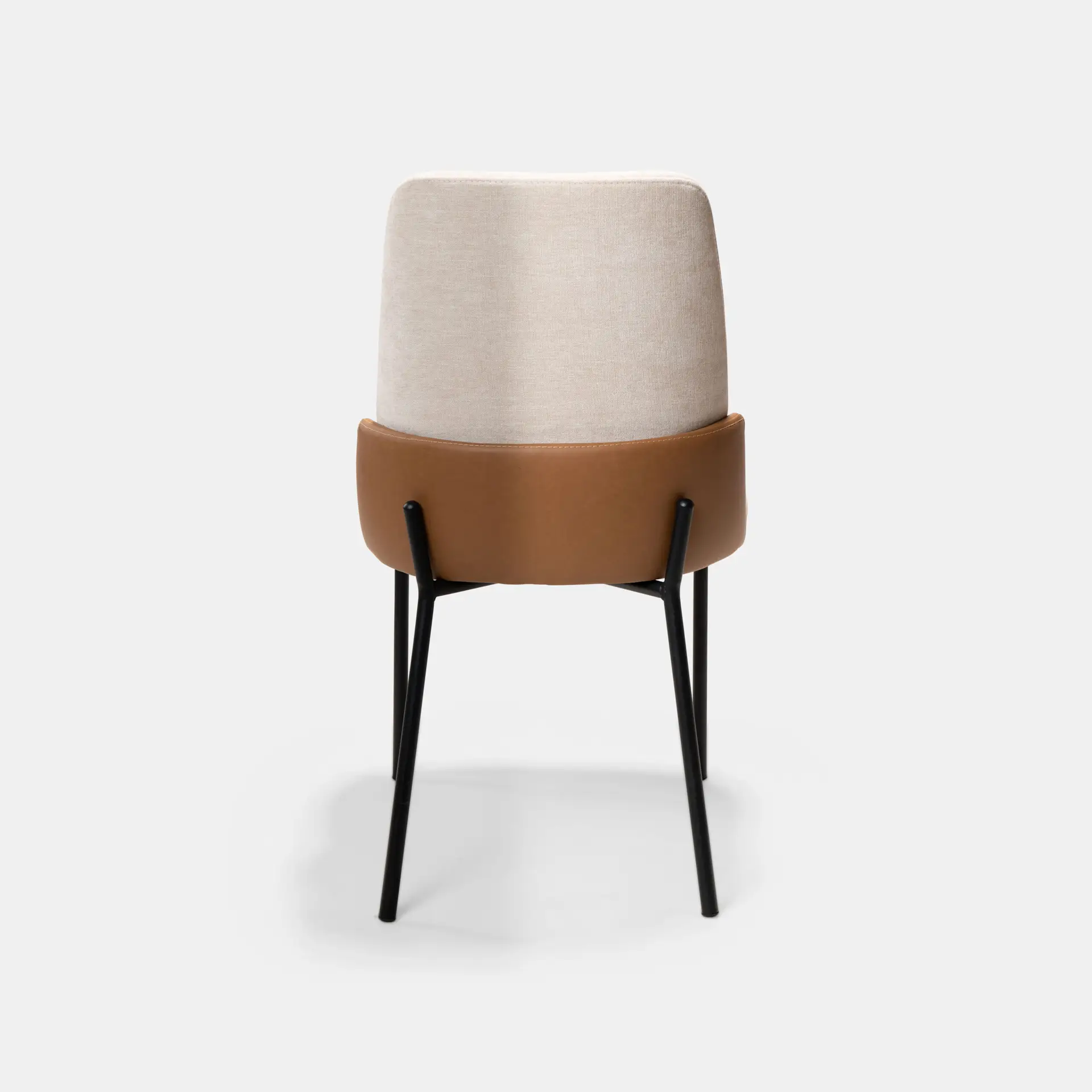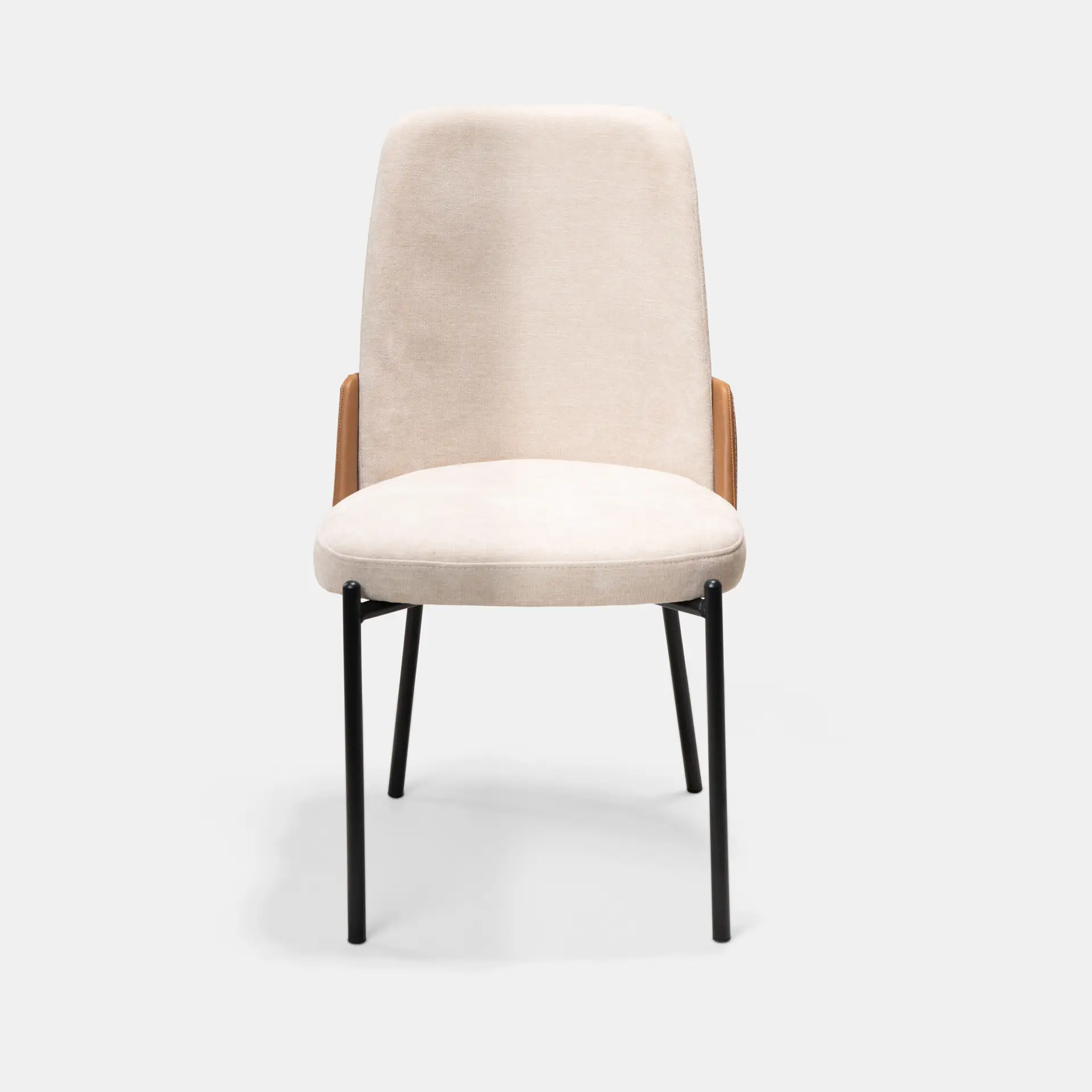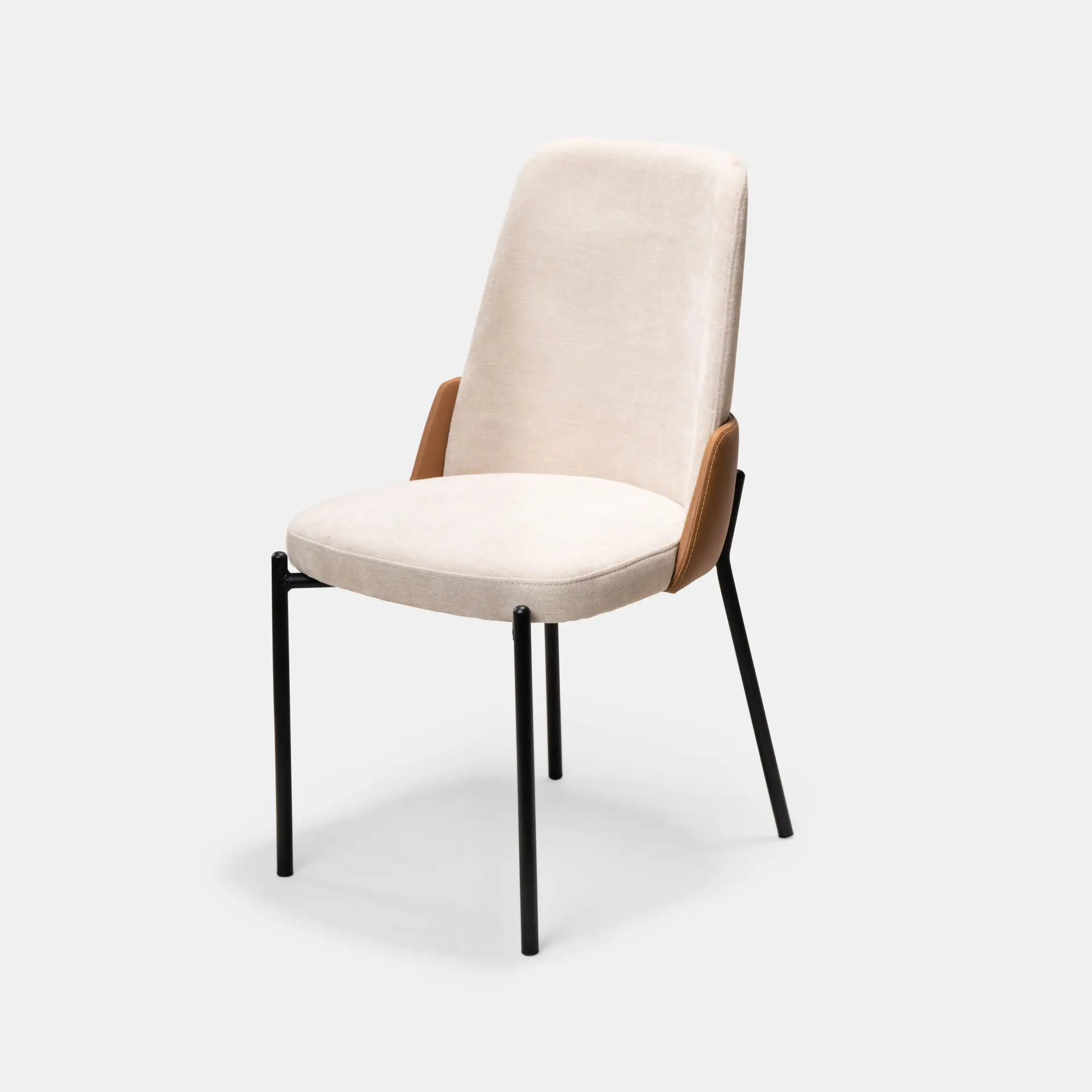 כיסא לפינת אוכל בשילוב בד בז' ודמוי עור כאמל, רגלי מתכת שחורות חזקות ואלגנטיות שעולות בעיצוב מיוחד על גבי גב הכסא. העיצוב, הגב הגבוהה ומושב בעל ספוג אלסטי כל אלו הופכים אותו לכליל השלמות – כזה CUTE !