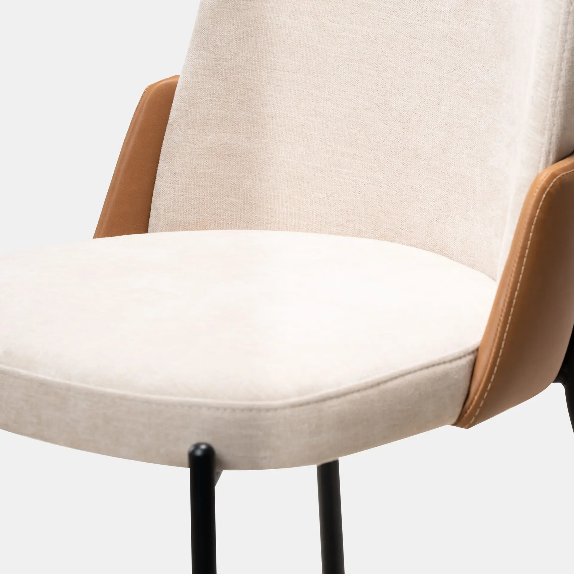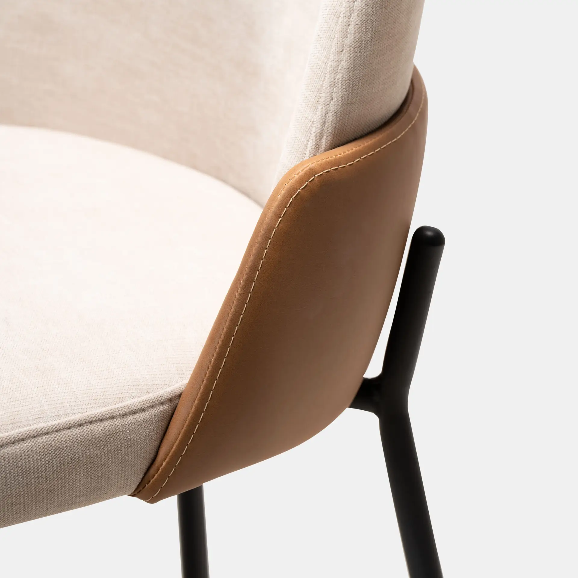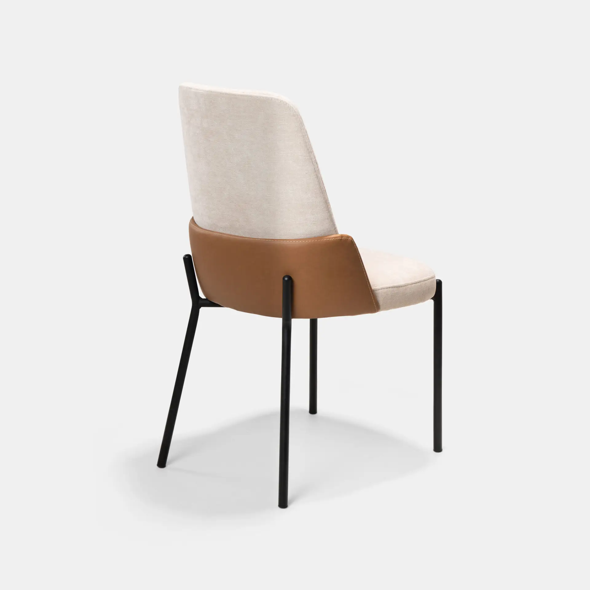 כיסא לפינת אוכל בשילוב בד בז' ודמוי עור כאמל, רגלי מתכת שחורות חזקות ואלגנטיות שעולות בעיצוב מיוחד על גבי גב הכסא. העיצוב, הגב הגבוהה ומושב בעל ספוג אלסטי כל אלו הופכים אותו לכליל השלמות – כזה CUTE !