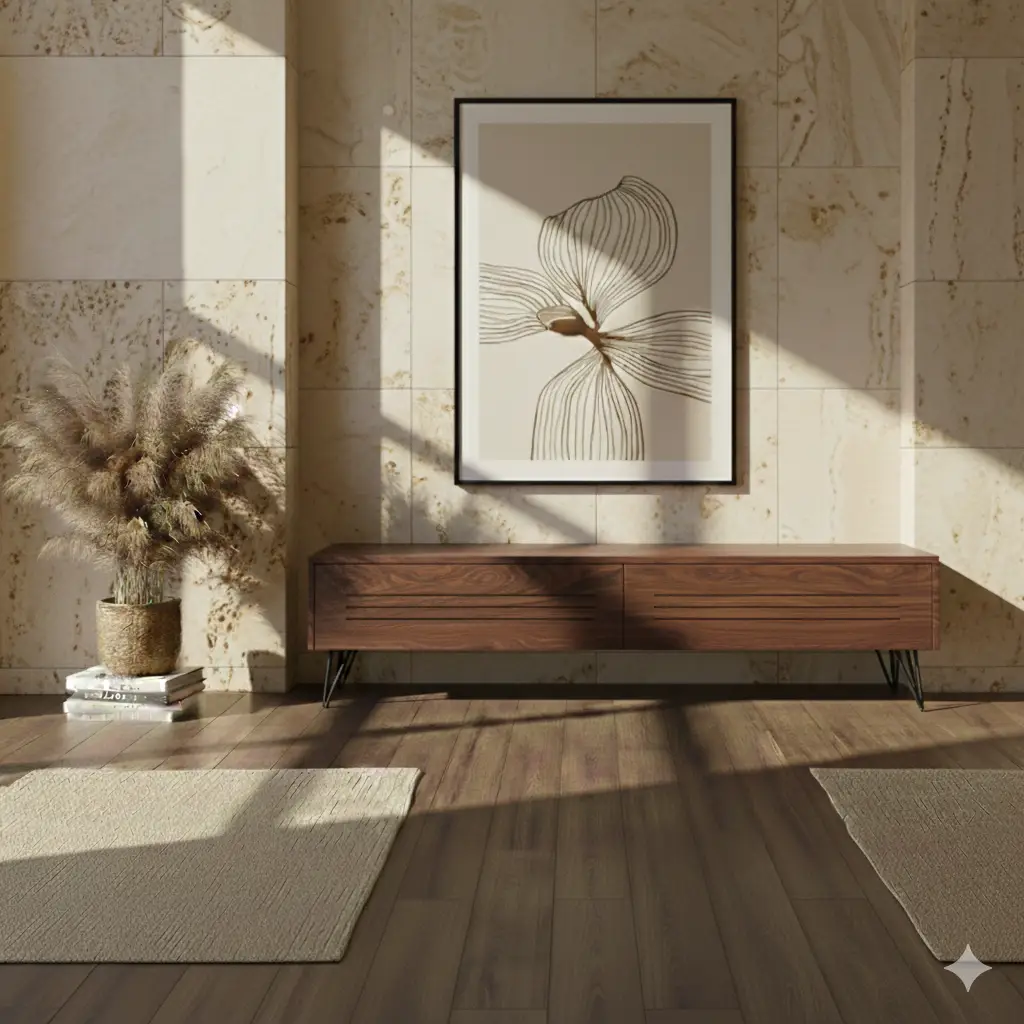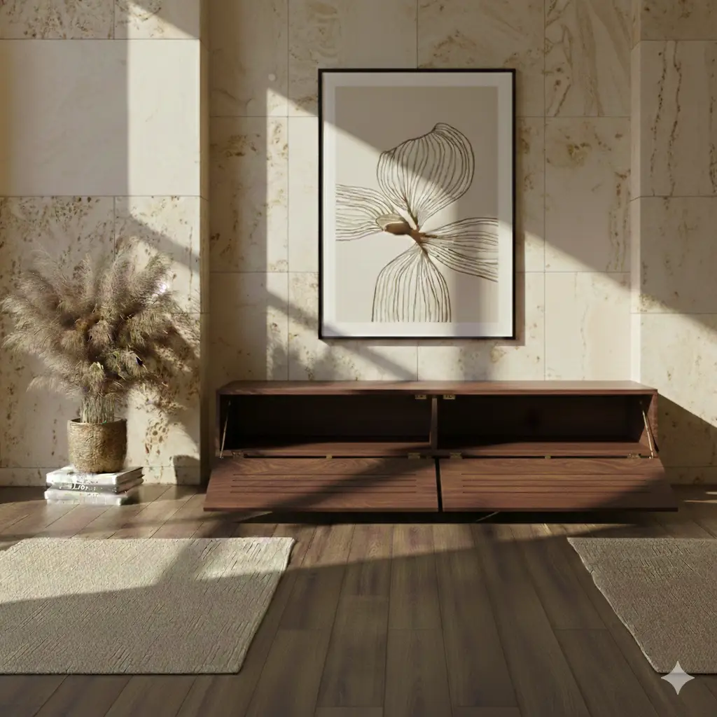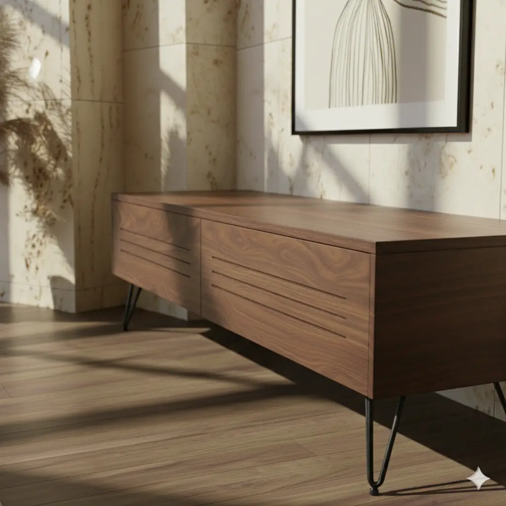 מזנון מודרני, שיקי וקליל בגוון עץ שחור עם מספר יתרונות: משאיר את החמימות של העץ והמודרניות של הצבע השחור שתמיד מתאים לטלוויזיה השחורה שמעליו. המזנון מחולק לשני קלאפות מעוצבות עם חיתוכים לרוחב, פרקטי במיוחד כשתרצי להניח את המדיה שצריכה קליטה ו\או אוורור. הקלפות נפתחות באמצעות מנגנון טאץ' כך שאפשר להישאר עם מראה נקי וקליל. כל היופי הזה מונח על רגליים מברזל מגולוון שחורות המעניקות מראה מרחף לכל היחידה.