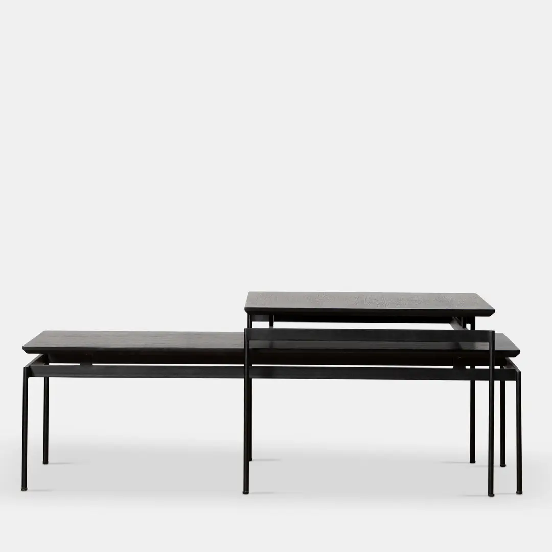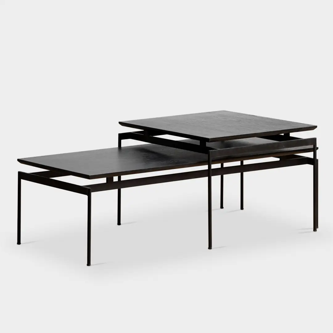 די לחיפושים! זוג שולחנות סלון אחד מעל השני, פרקטי מאוד לכל סלון. עשויים עץ תעשייתי בחיפוי פורניר עץ אלון בצביעת פוליטורה שחורה. מסגרת ברזל מגולבן קלילה להשלמת המראה. זה פרקטי, זה קל לניקוי ועמיד וזה מתאים פשוט לכל סלון שיש בו טלוויזיה שחורה.